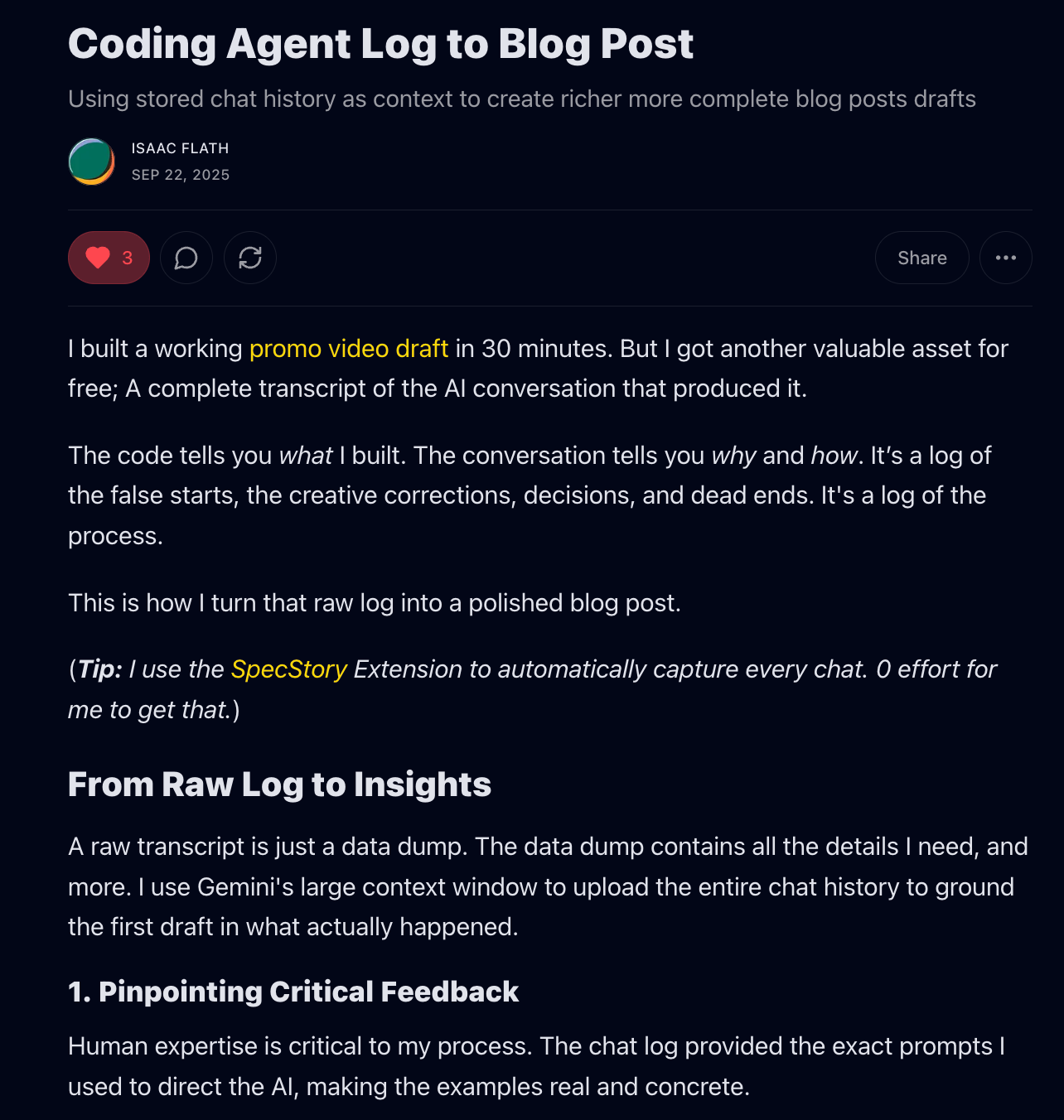 Isaac realized his SpecStory history was more than just a transcript. It captured the full flow of his coding session: the back-and-forth corrections, the points where the AI got things wrong, and the debates where he had to defend or rethink his design choices. He turned those conversation history into a blog post.